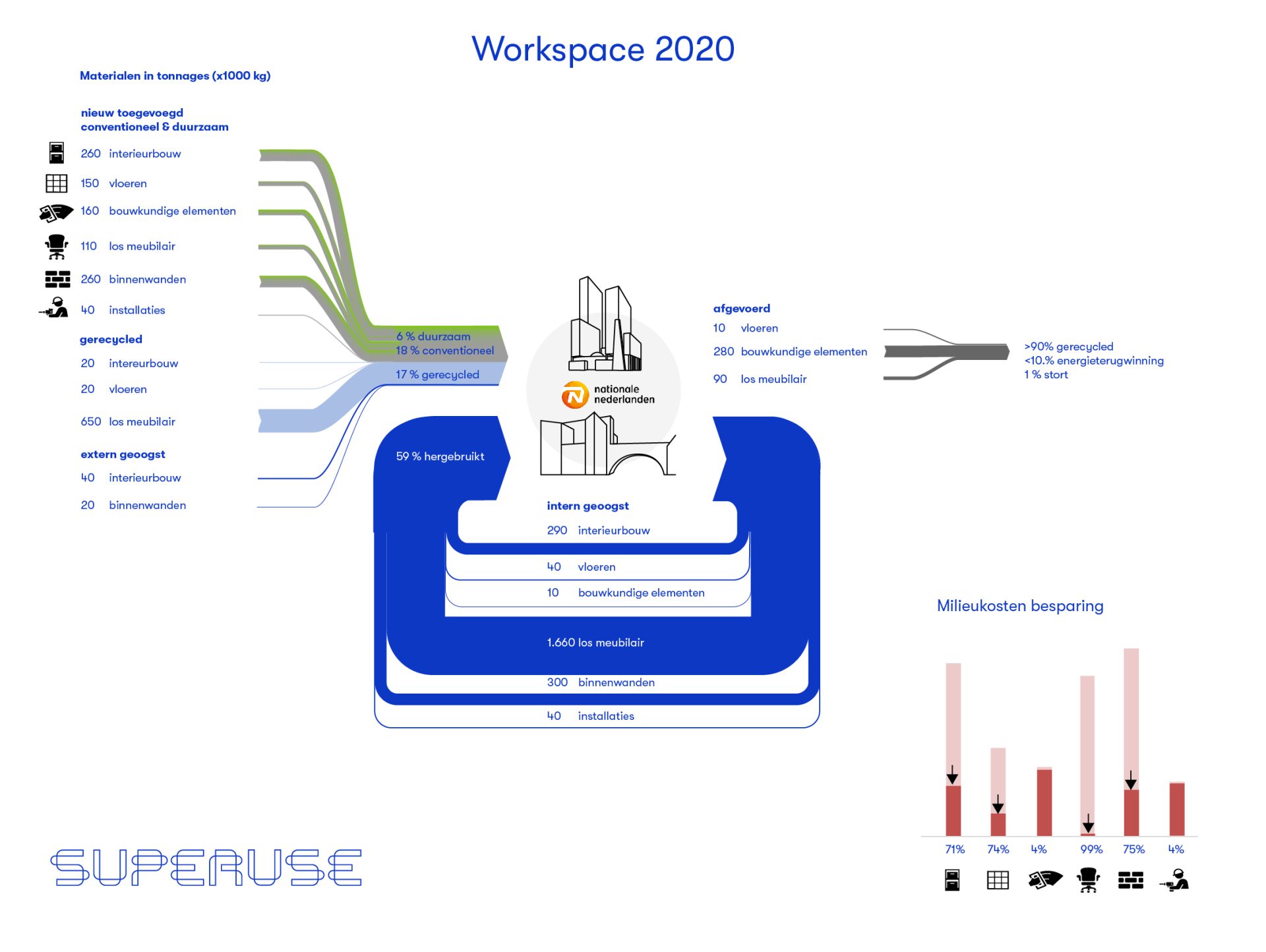 Voor Nationale Nederlanden trad Superuse partner Floris Schiferli op als circulair regisseur tijdens de transformatie van kantoorgebouwen Delftse poort en Haagse poort. Superuse nam deel in het bouwteam en ondersteunde hier de opdrachtgever Nationale Nederlanden, de architect Fokkema & Partners en de verschillende aannemers. Superuse zorgde ervoor dat op cruciale momenten in het proces de meest circulaire keuzes gemaakt werden. Niet alleen door de definitie te geven van wat ‘circulair’ is, maar ook door te sturen en te begeleiden in het bouwproces. Hierdoor kon een radicale daling van de MKI score worden bereikt en was de afvalproductie nihil.